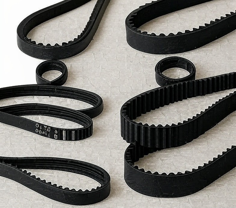 Industrial Belts enable machinery power transmission, with V-belts wedging into pulleys for slippage-free torque and timing belts using teeth for precise synchronization. V-belt types include classical A/B/C for general use, narrow 3V/5V/8V for compact high-power, and cogged/banded for flexible multi-pulley setups. Timing belt variants feature HTD for heavy torque loads, GT with curvilinear teeth for smooth engagement, and PU for precision in automotive and robotics.