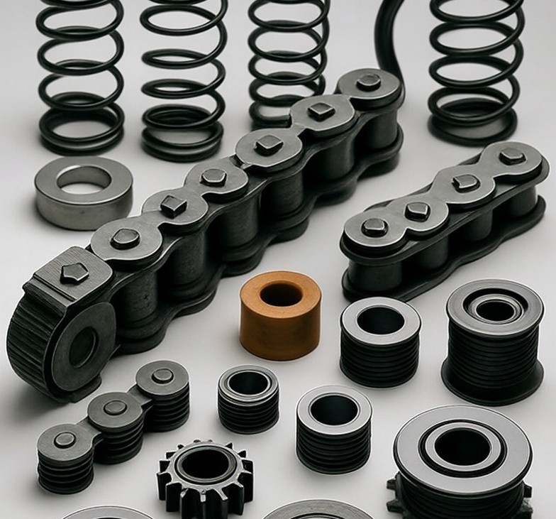 Pulleys guide belts or ropes to redirect forces, couplings connect shafts to transmit torque with flexibility, lubricants reduce friction to extend component life (via methods like drip or oil bath), and gaskets seal joints to prevent leaks and contamination in assemblies. roller chains—composed of linked rollers and bushings—transmit power efficiently between sprockets, which are toothed wheels designed to engage chain links for precise motion control.